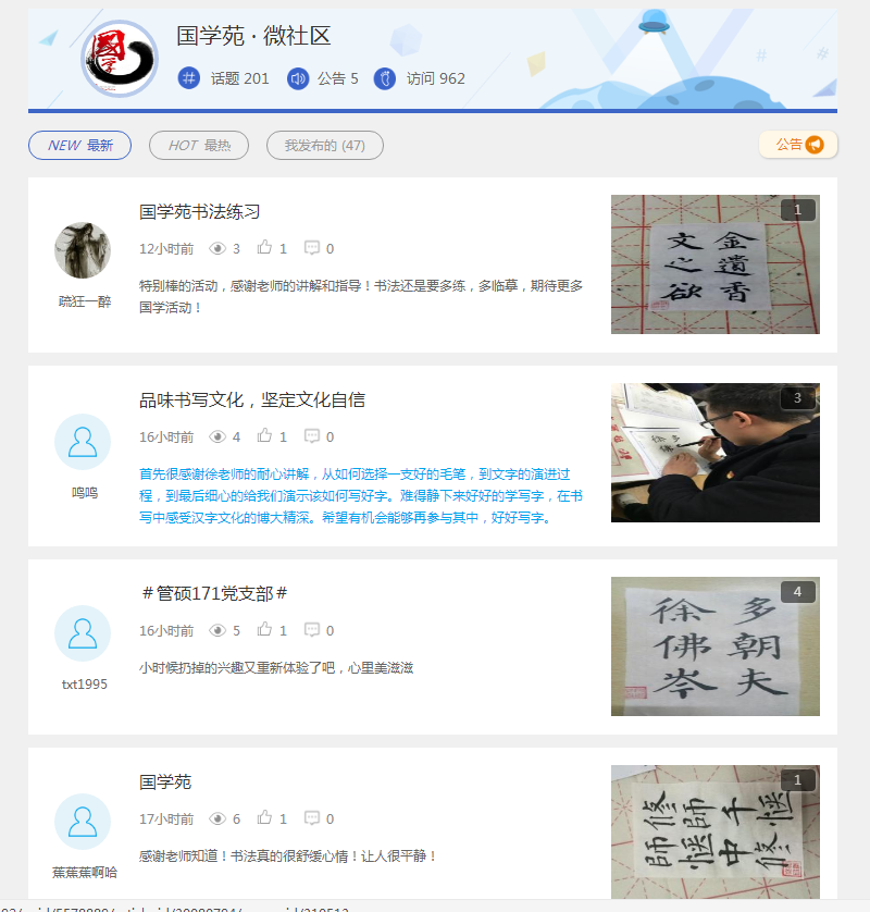 据悉,“国学苑”作为易班品牌建设项目开办至今,发布话题帖201个,上传国学资料200多份,累计访问量962人次,线下活动举办十五场,累计参与学生研习活动近400人次;开辟传播优秀传统文化的在线平台,为更多学生了解国学、学习国学并能继承和发扬国学提供良好平台,培养“通古博今、经天纬地”的经管精英。