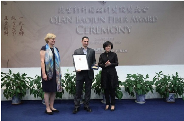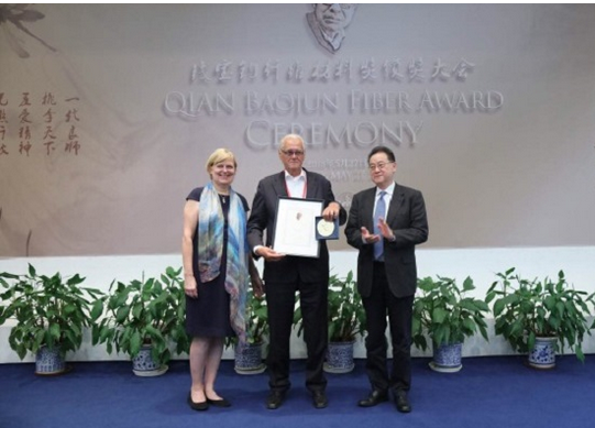 图说:原埃因霍芬理工大学的皮特·雷姆斯特教授获得“钱宝钧纤维材料杰出贡献奖”。