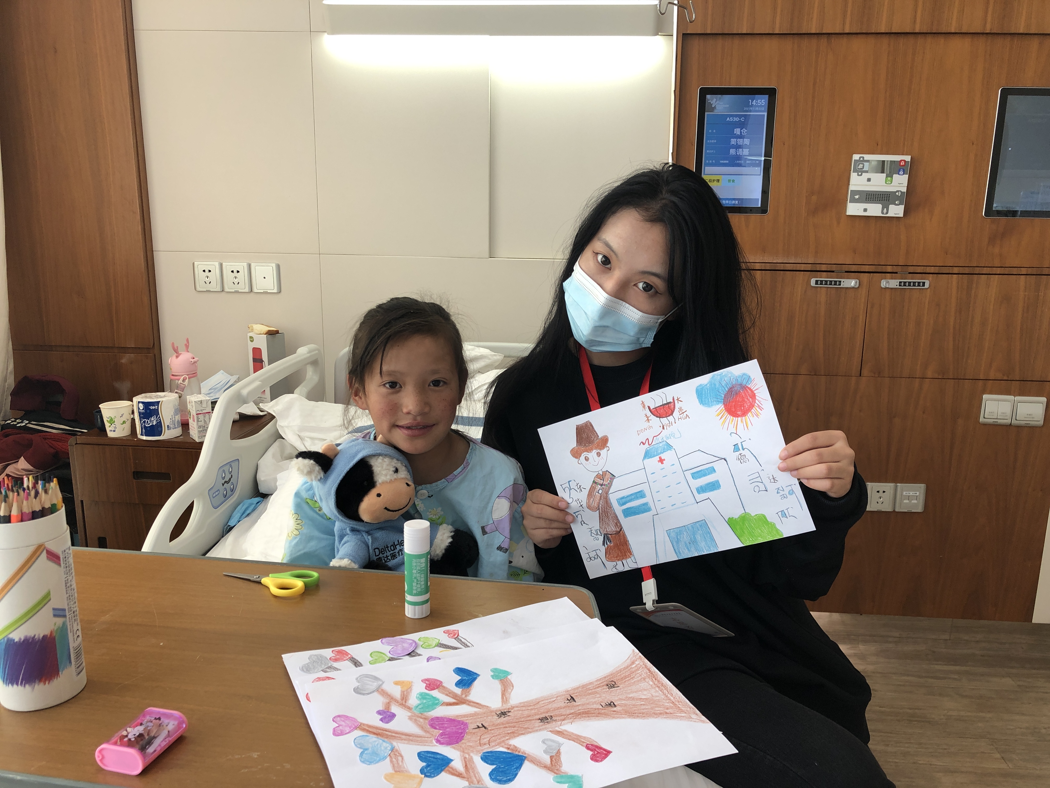 在短短5天时间里,10名志愿者为病房带来了笑声和温暖。嘎仓是此次接受救治的先心病患儿之一,十一岁的她身材瘦小,看起来像个五六岁的孩子,因长期患病导致她性格内敛,总是一言不发地坐在病床上,鲜少与人交谈。志愿者的到来打破了病房里的寂静,他们用家乡的语言抚慰着嘎仓,同她一起画画、做手工。嘎仓认真地往“画作”上填充颜色,画出了医院、东华的校徽,还有健康出院的藏族小姑娘,她的脸上也逐渐露出了笑容。