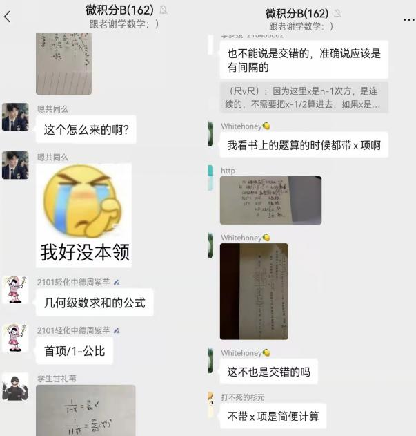 经过各门课程答疑群里的积极互动,不仅激发了同学们的学习热情,还拉近了师生距离。几何与多元微积分B(上)七班的同学们亲切地称呼任课老师谢峰为“老谢”,他们组建的学习群叫做“跟老谢学数学”。学生们在群里不仅向“老谢”请教问题,也彼此交流学习心得,在“茅塞顿开”后还不忘发个表情包来自我调侃。