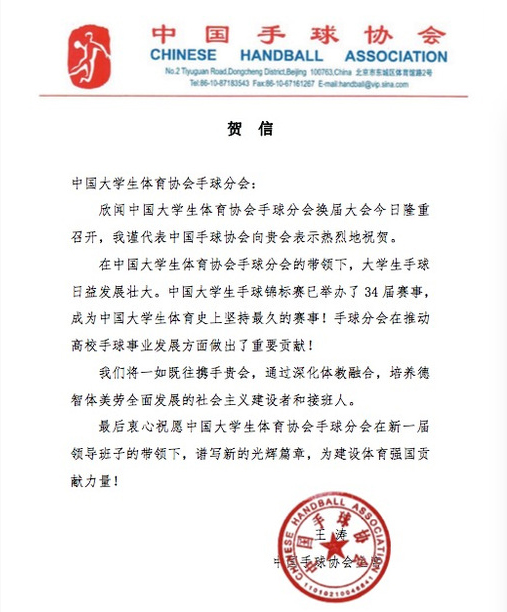 (中国手球协会发来贺电)